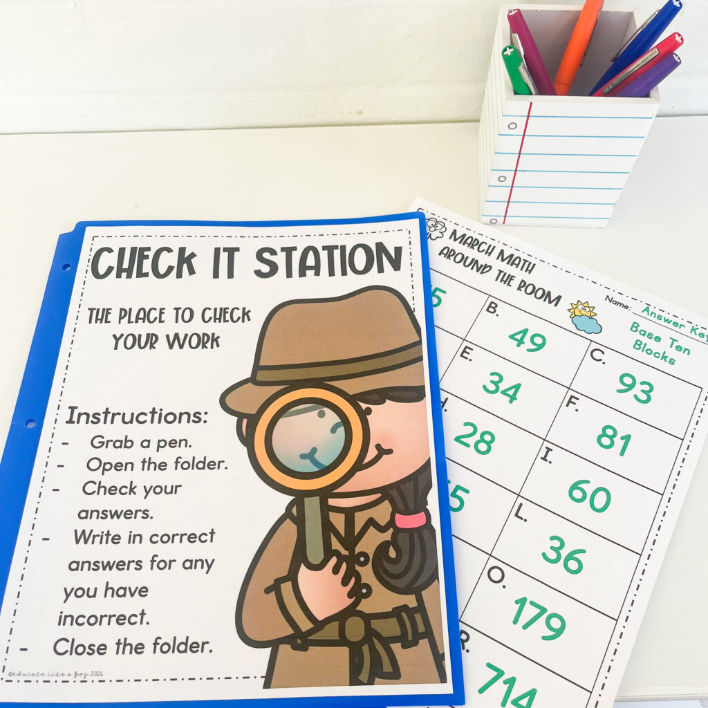 Using self-checking centers is one of the easiest ways to reduce your grading workload. In the centers mentioned above, there is a “check it station” resource included. Making it a fun space where students can look at the answers, “be the teacher,” and check their own work using something like a special pen, makes it engaging for students while also saving you grading time. You can still collect the work and see student progress, without having the stress of adding to your grading.